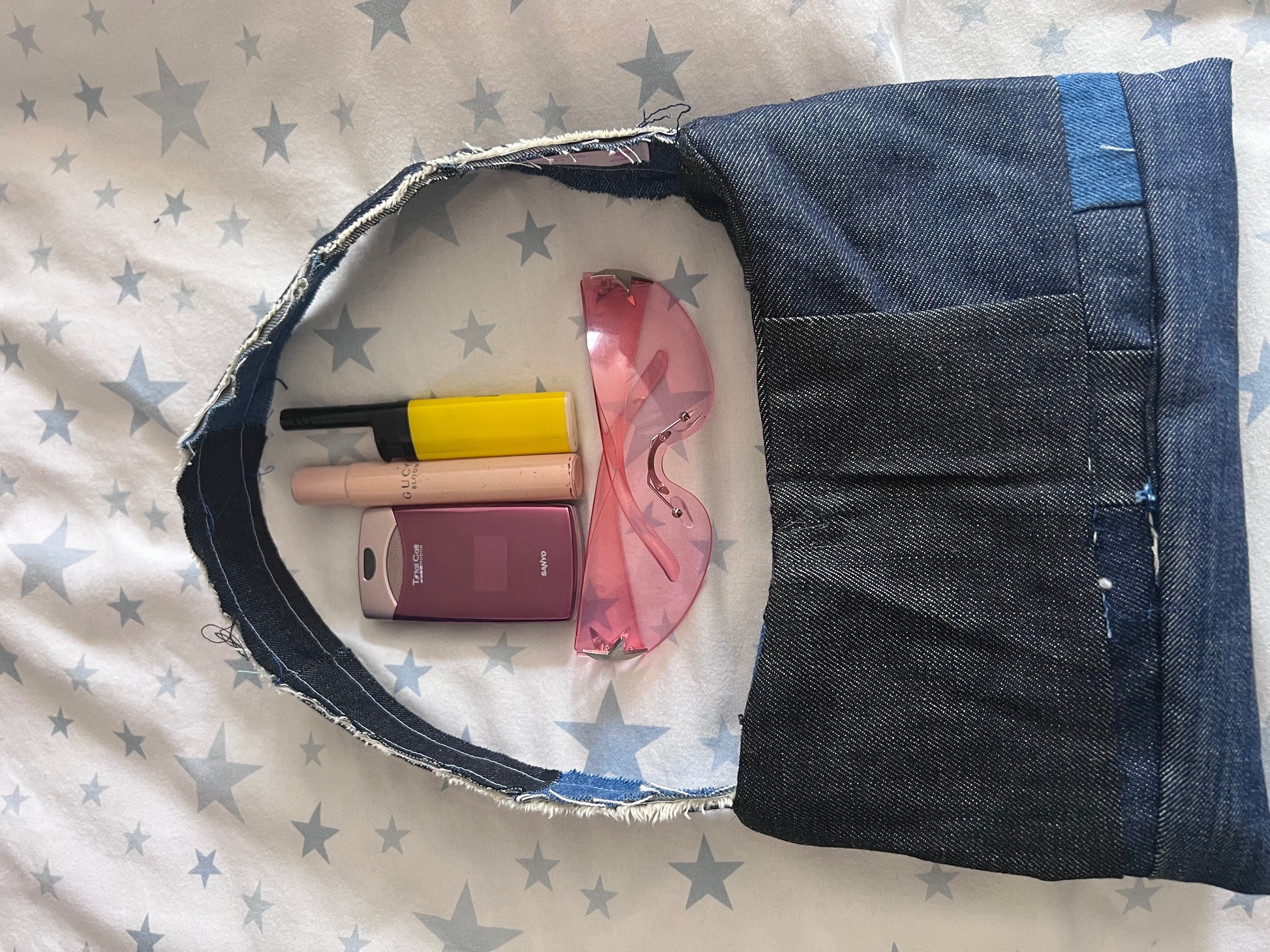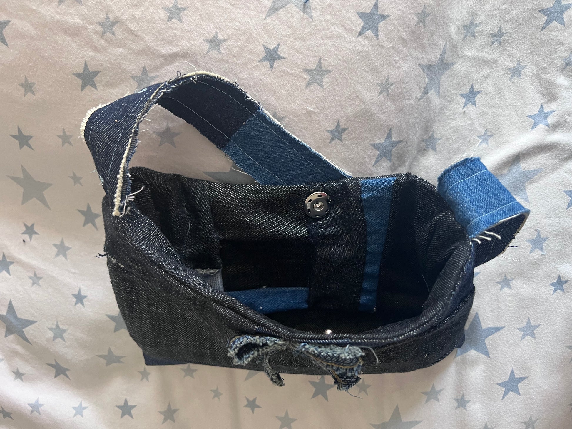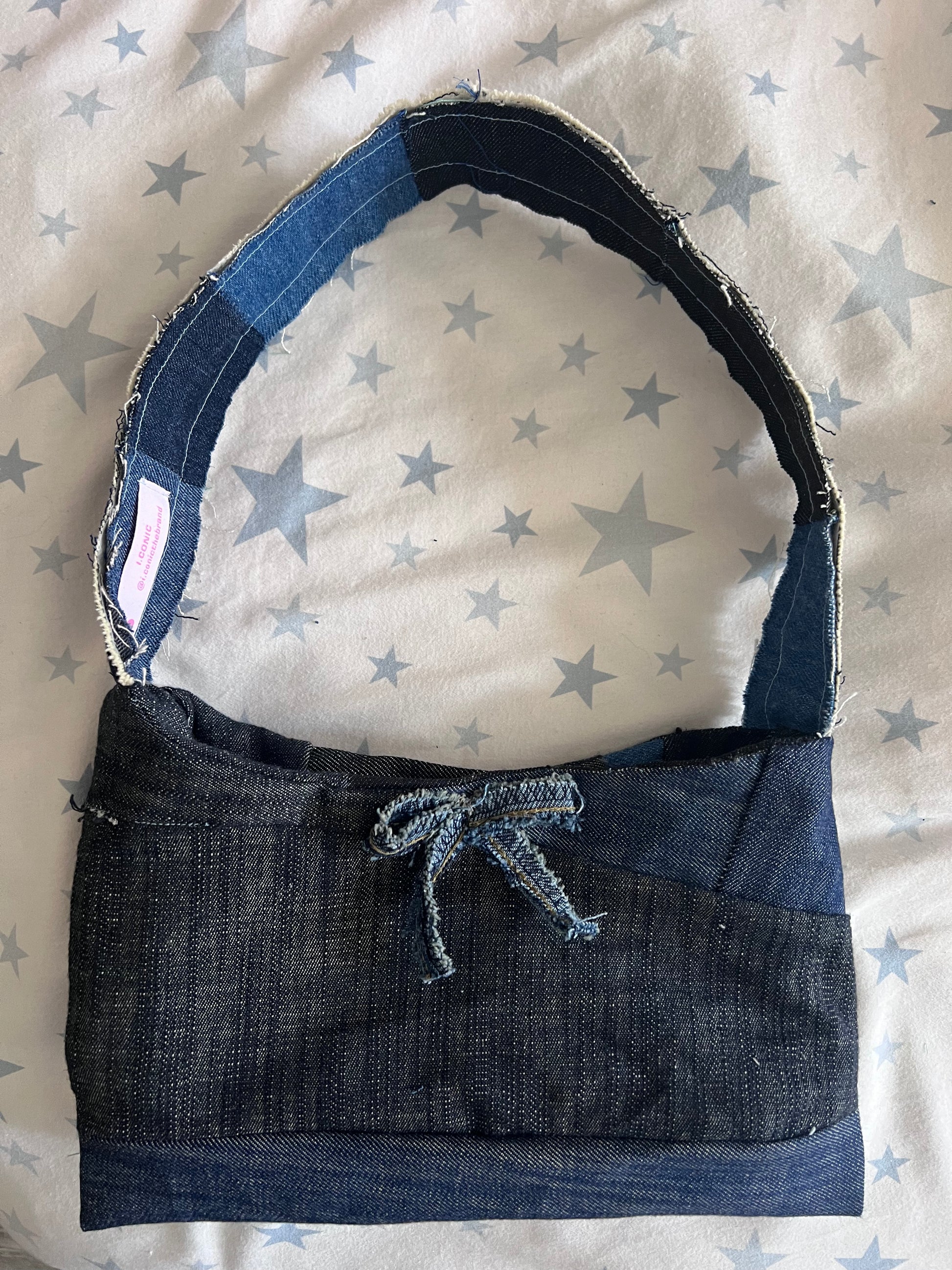 The Bow-bow denim patchwork bag that makes a feminine & street style statement. This 1:1 bag is crafted from handmade patchwork denim & has a snap closure.