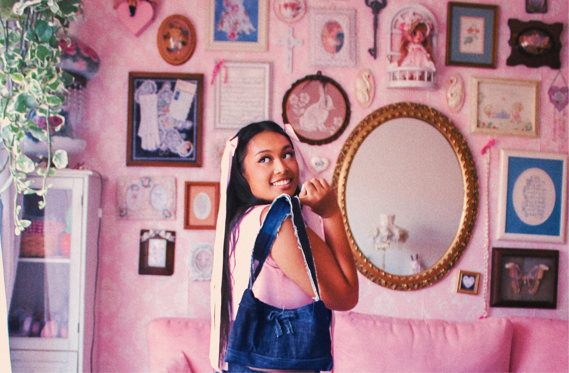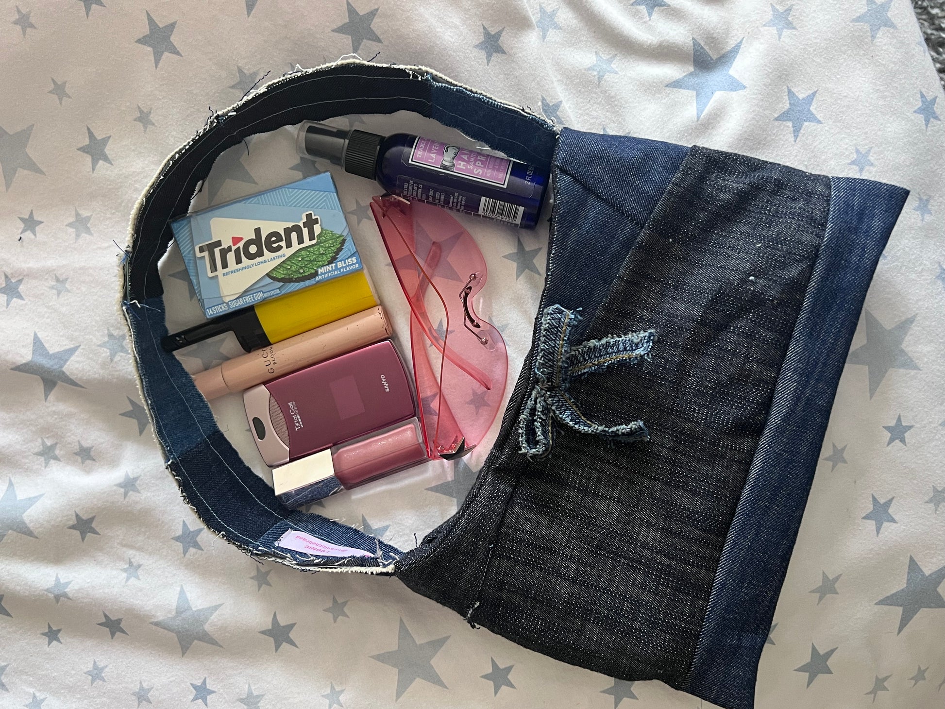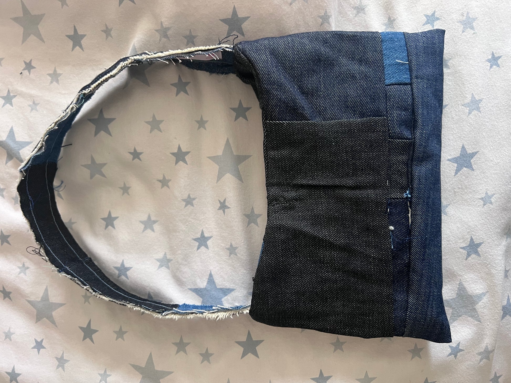 The Bow-bow denim patchwork bag that makes a feminine & street style statement. This 1:1 bag is crafted from handmade patchwork denim & has a snap closure.