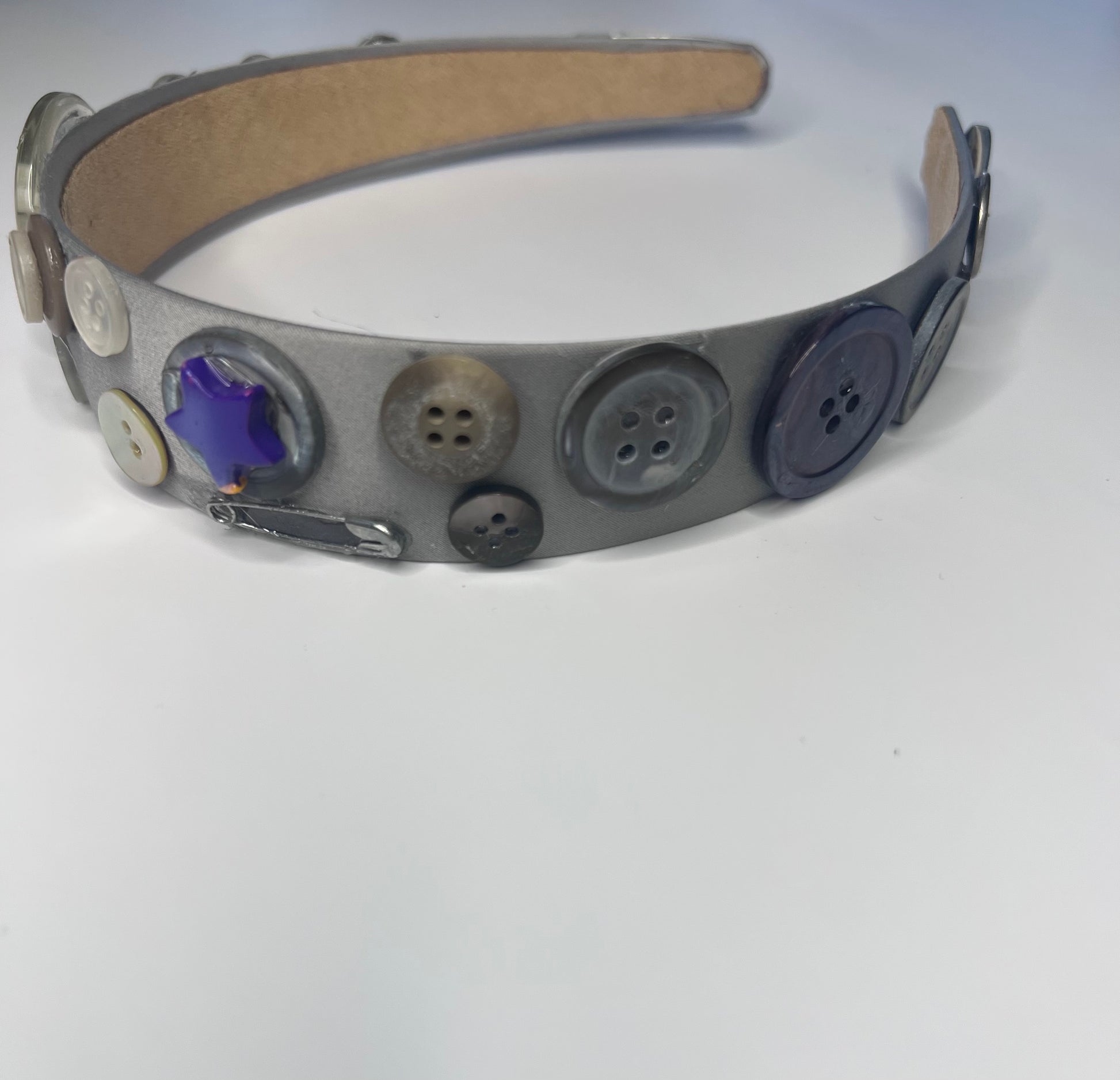 Make a bold statement with the Drama Queen button headband. This classic wide headband is curated with buttons & safety pins. It adds an instant pop of personality to any look while keeping your hair perfectly in place. Playful and eye-catching, it's the perfect accessory to showcase your confidence and y2k flair.