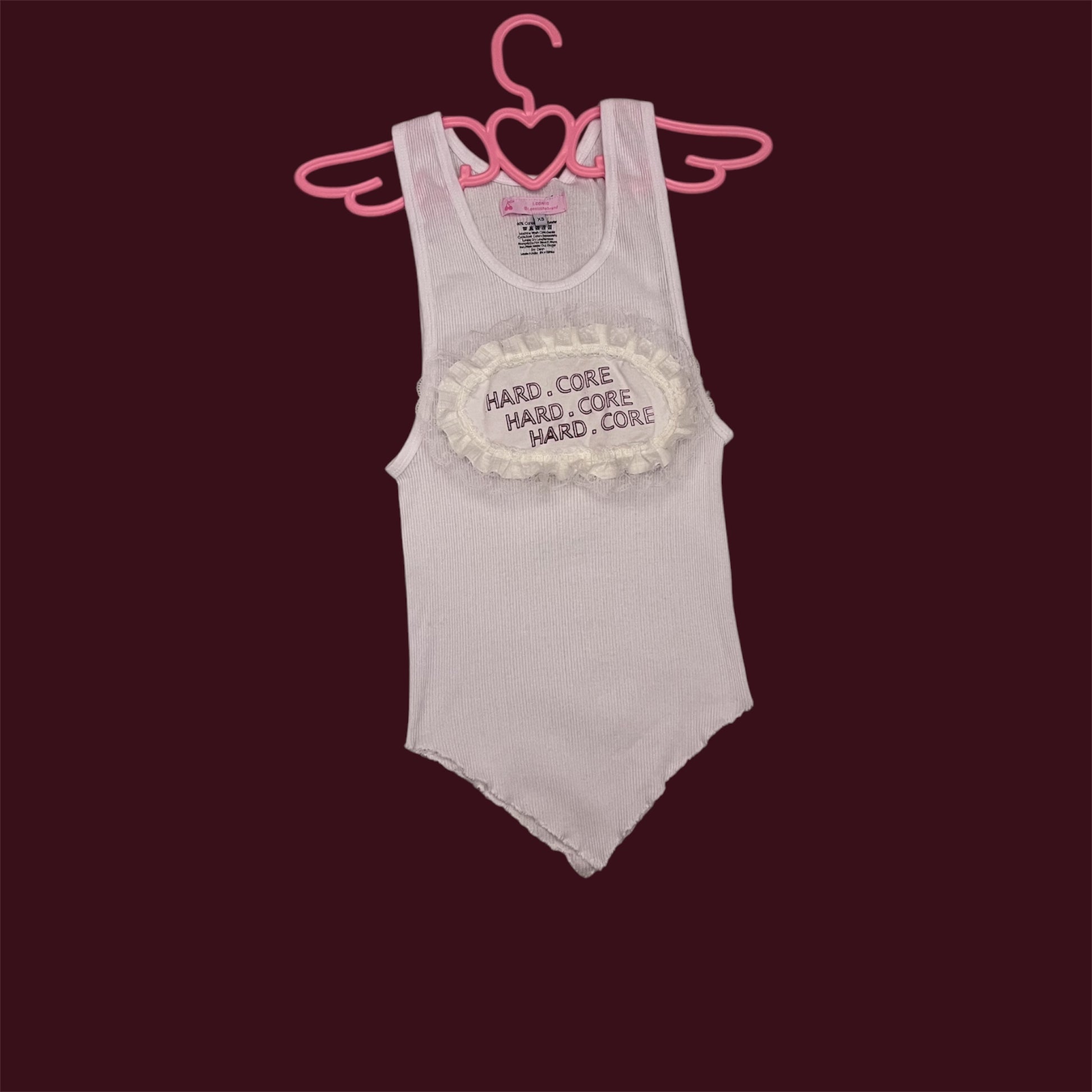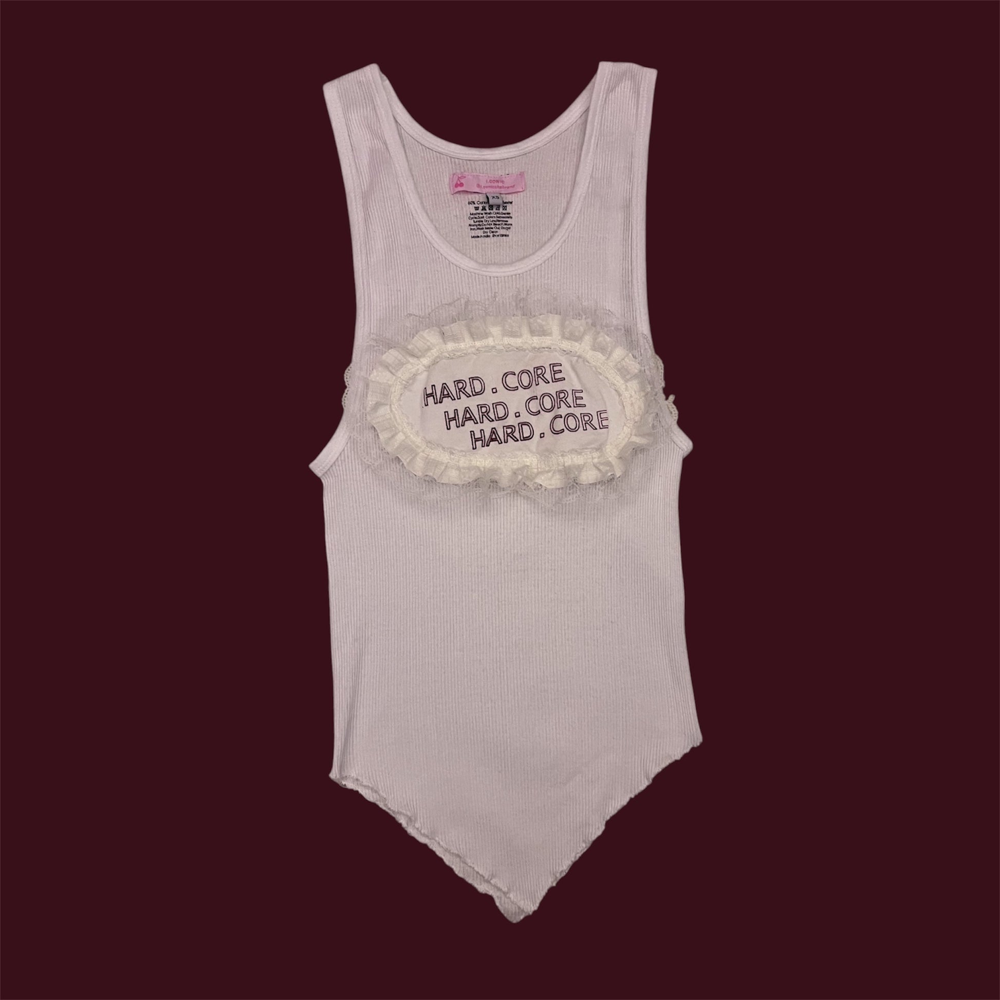 Made from upcycled t-shirt from an I.CONIC tee, this tank features delicate lace trim for a unique and sustainable look. Stand out from the crowd while reducing waste, all in one tank.