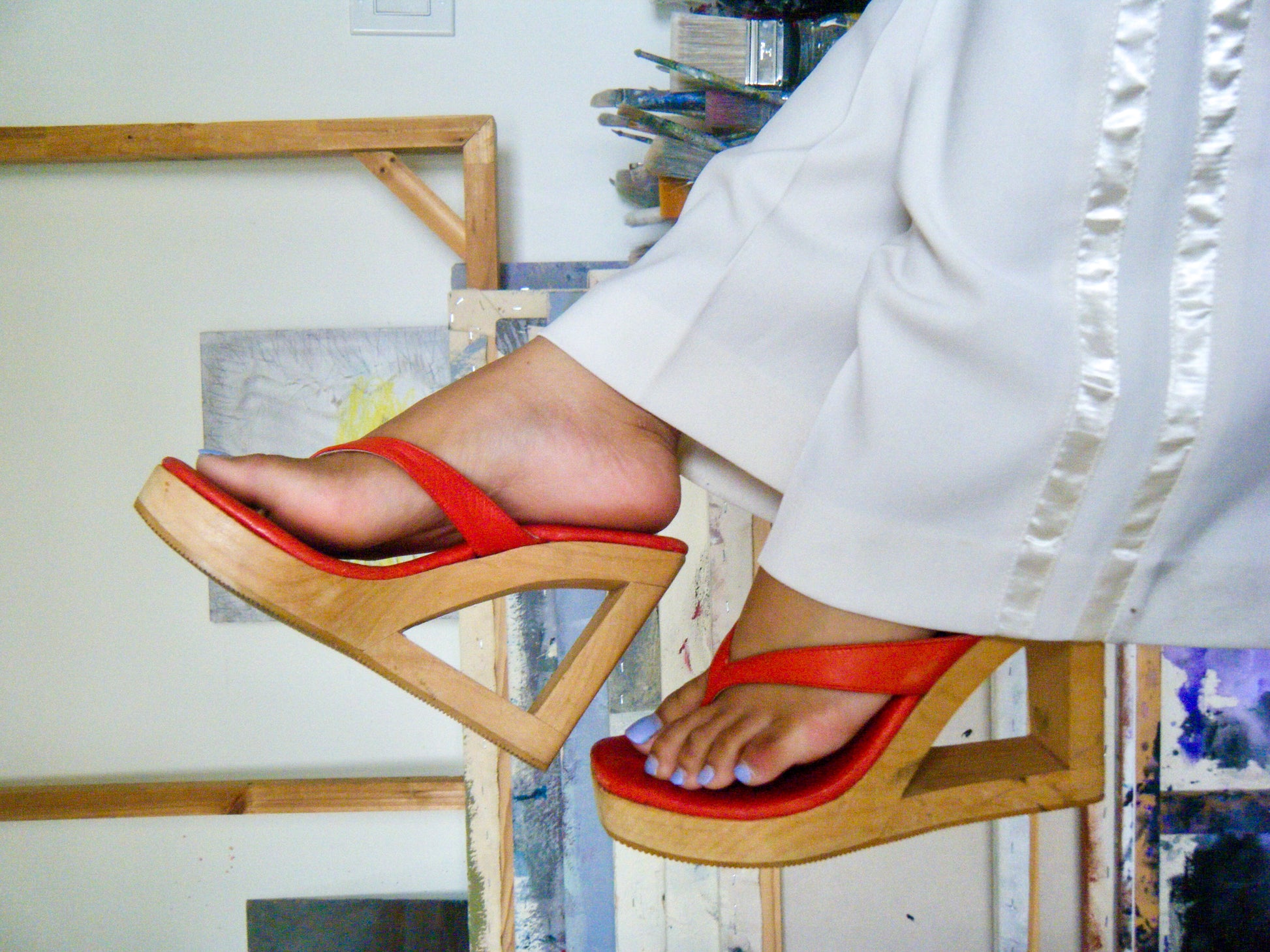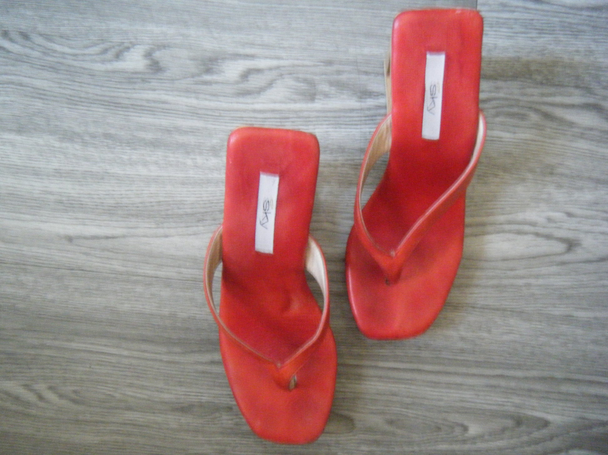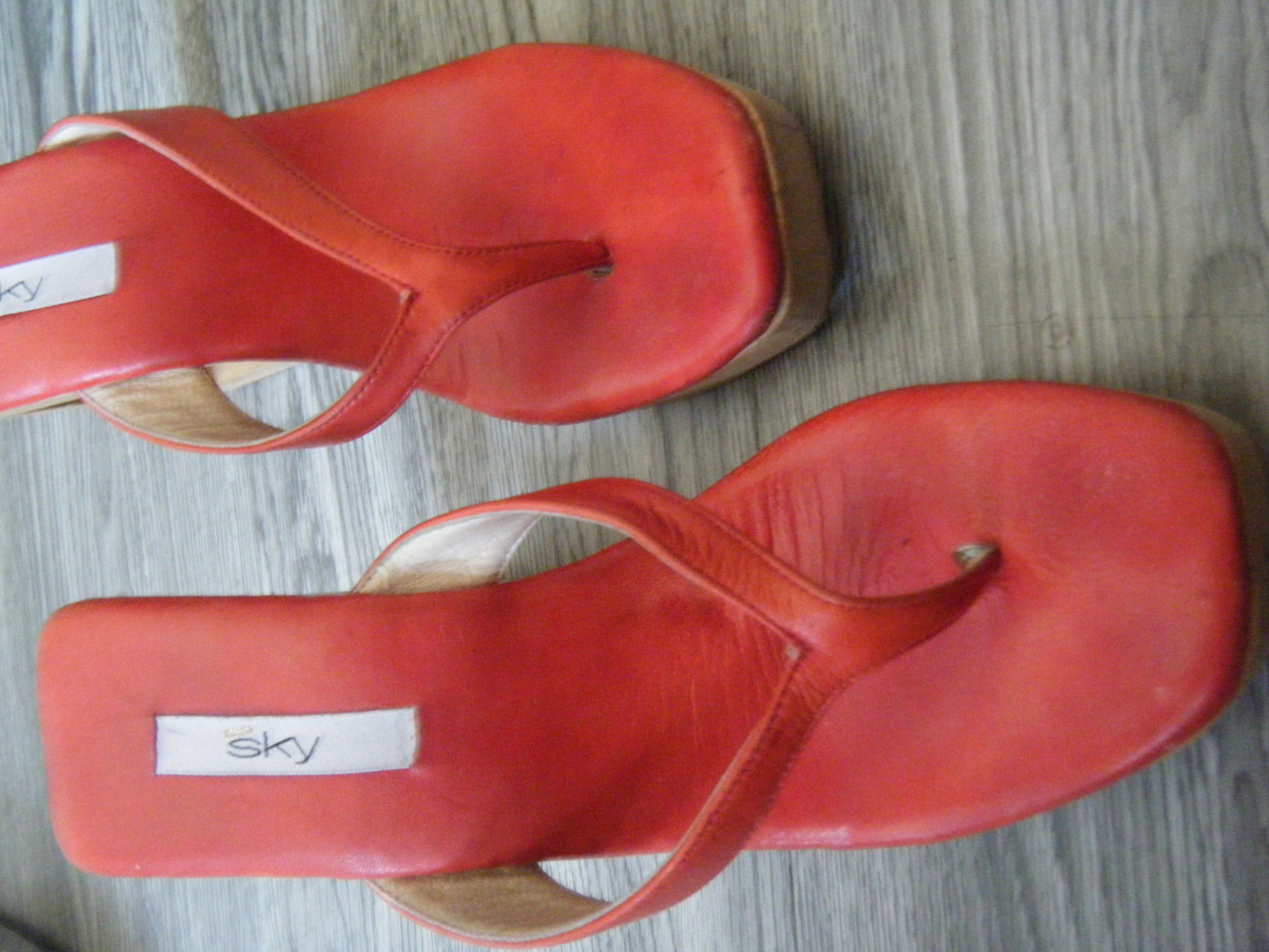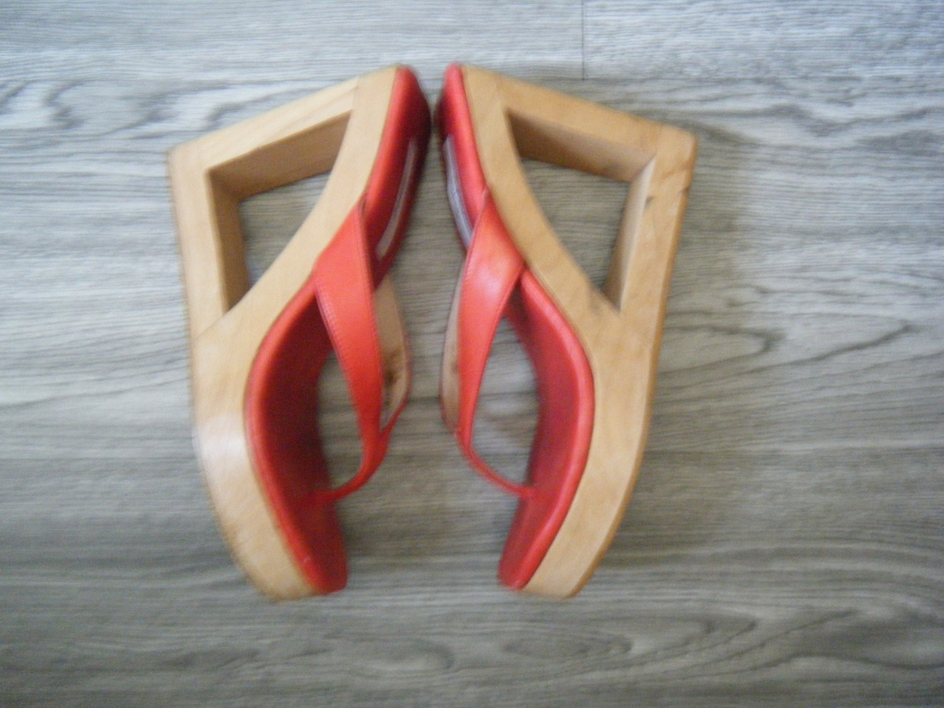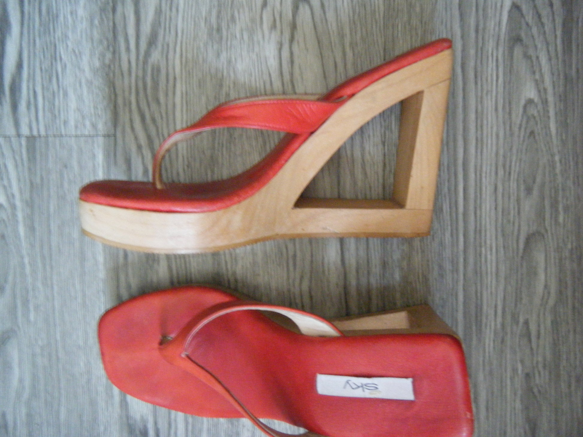 Introducing our Unique Wood Platform Clogs, sourced exclusively in LA. This rare pair of Sky shoes features red leather thong straps and a striking geometric cut-out on the wedge, making them a bold statement sandal. These have been professional stretched by a local cobbler ensuring the perfect fit.