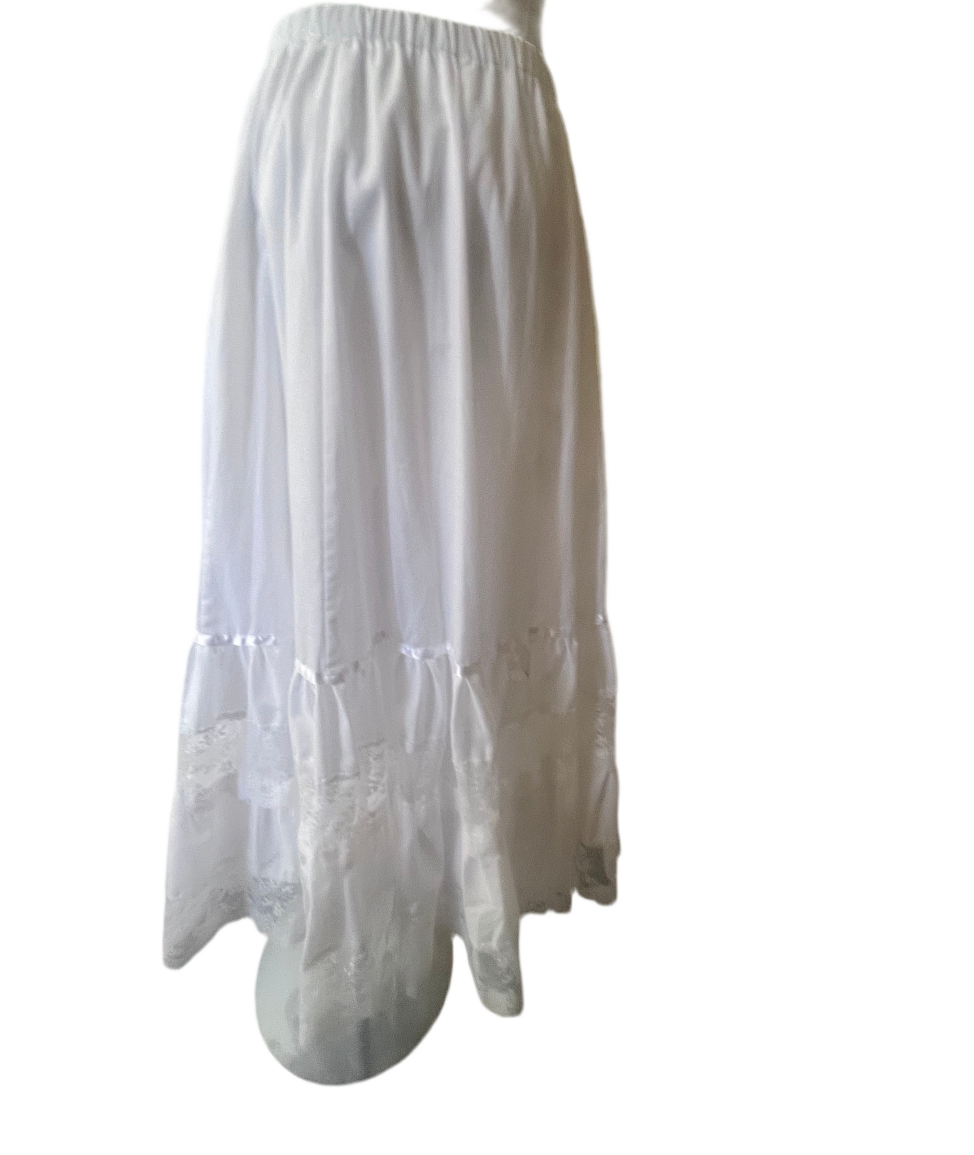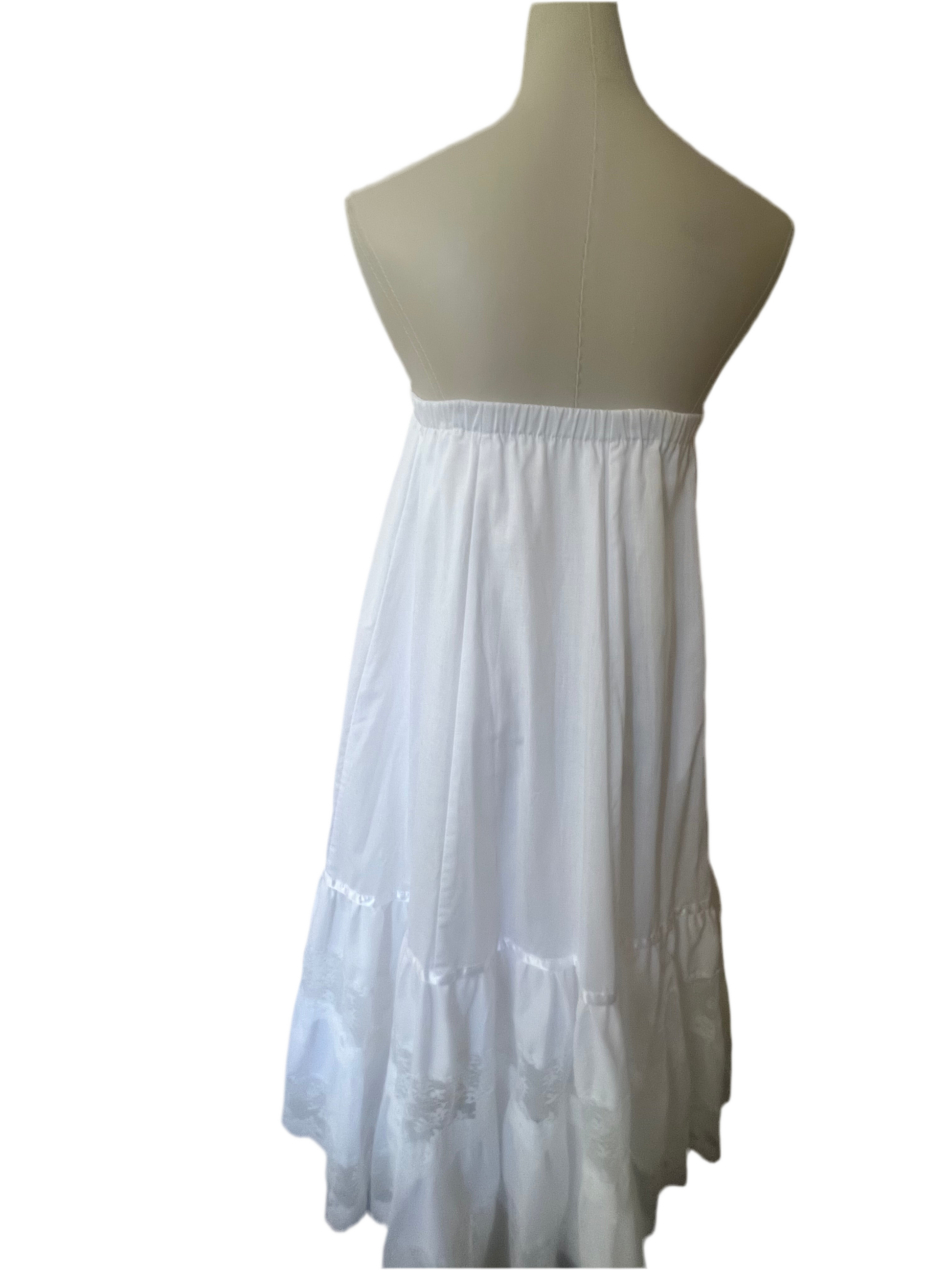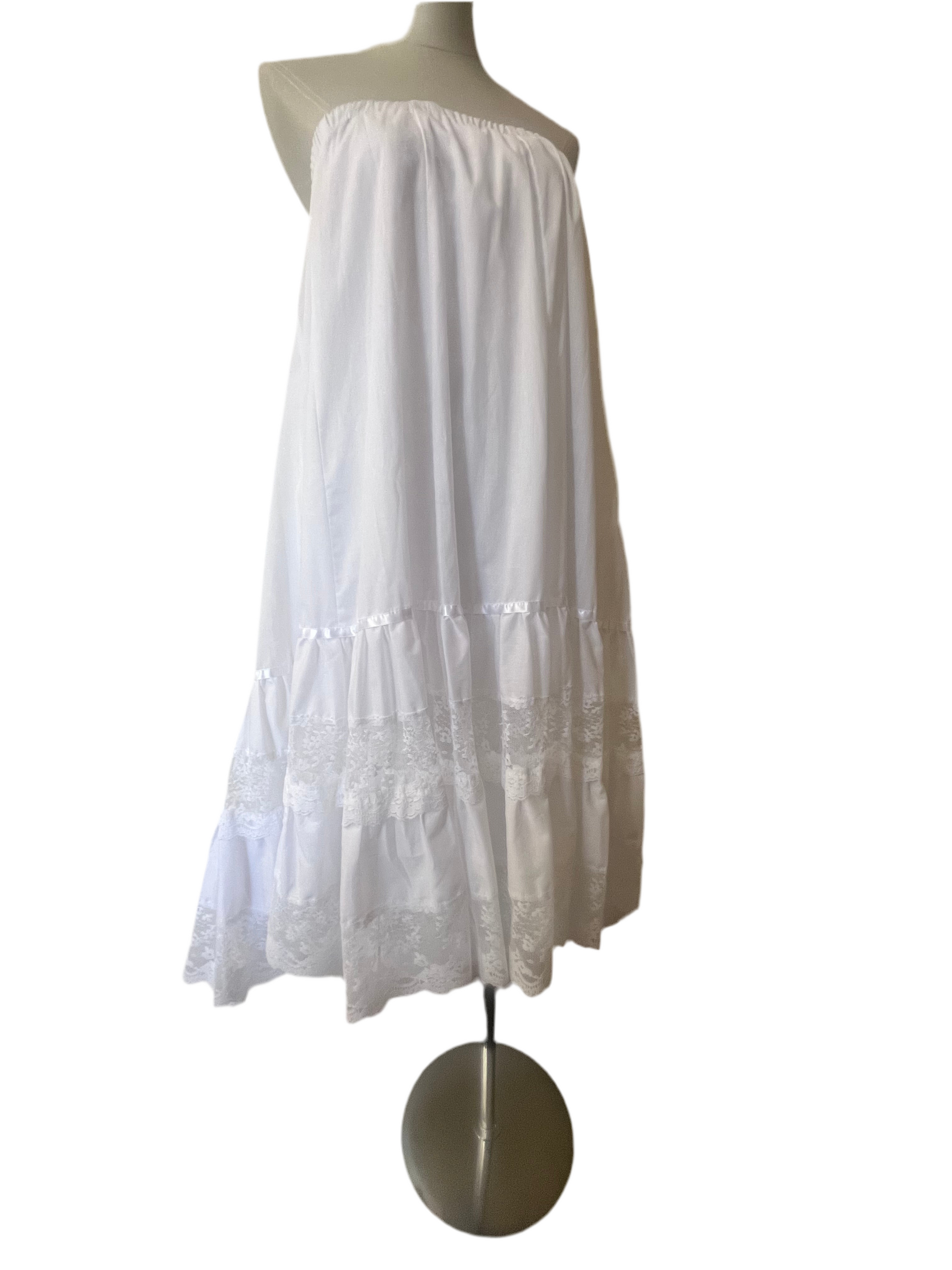 A true ethereal dream. Perfect for layering under dresses or wearing as a skirt or a strapless dress on its own, its delicate lace and satin ribbon accents add a touch of vintage-inspired romance. Meticulously dry cleaned and ready to wear.