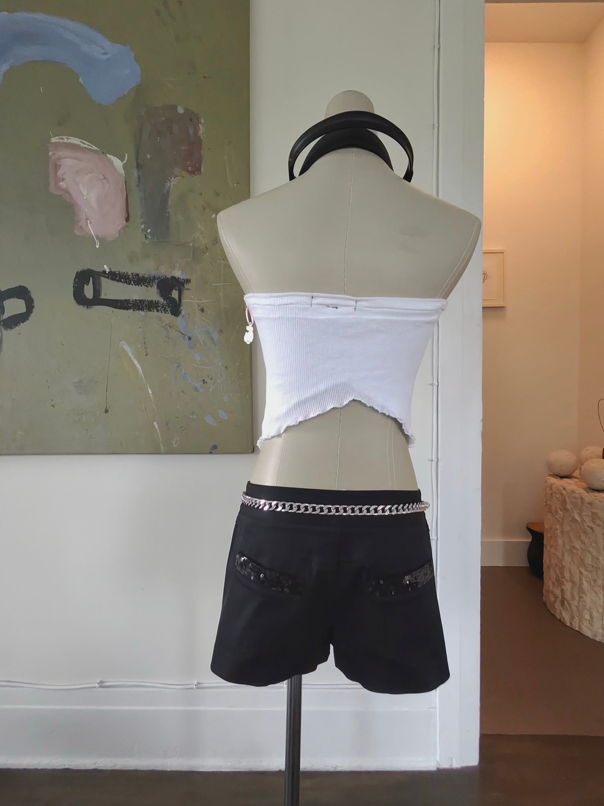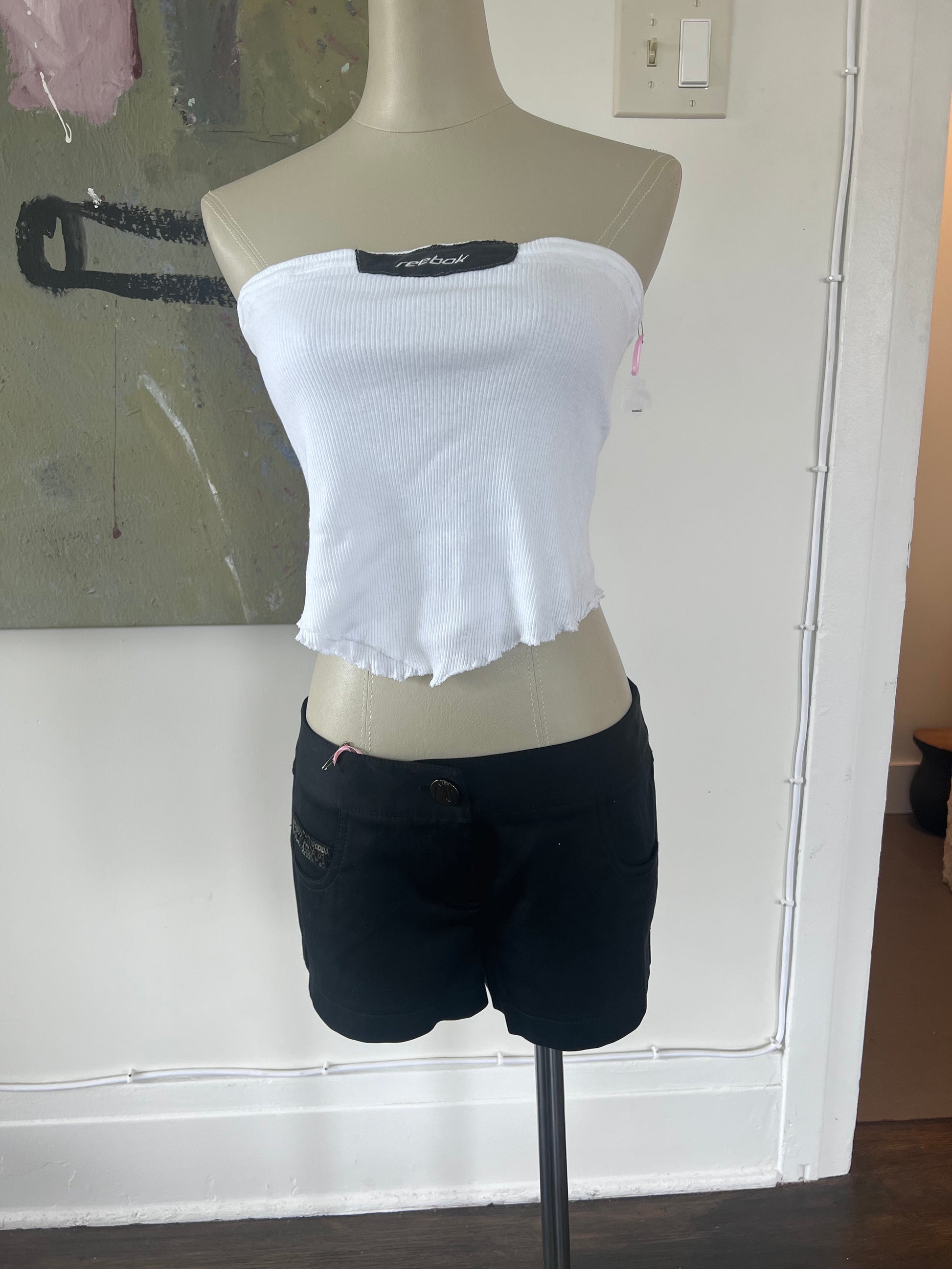 Crafted from scrap upcycled tanks and a vintage Reebok sports bra, this tube top is both sustainable and stylish. The angled lettuce hem adds a unique touch, while the fitted and cropped design flatters your curves.