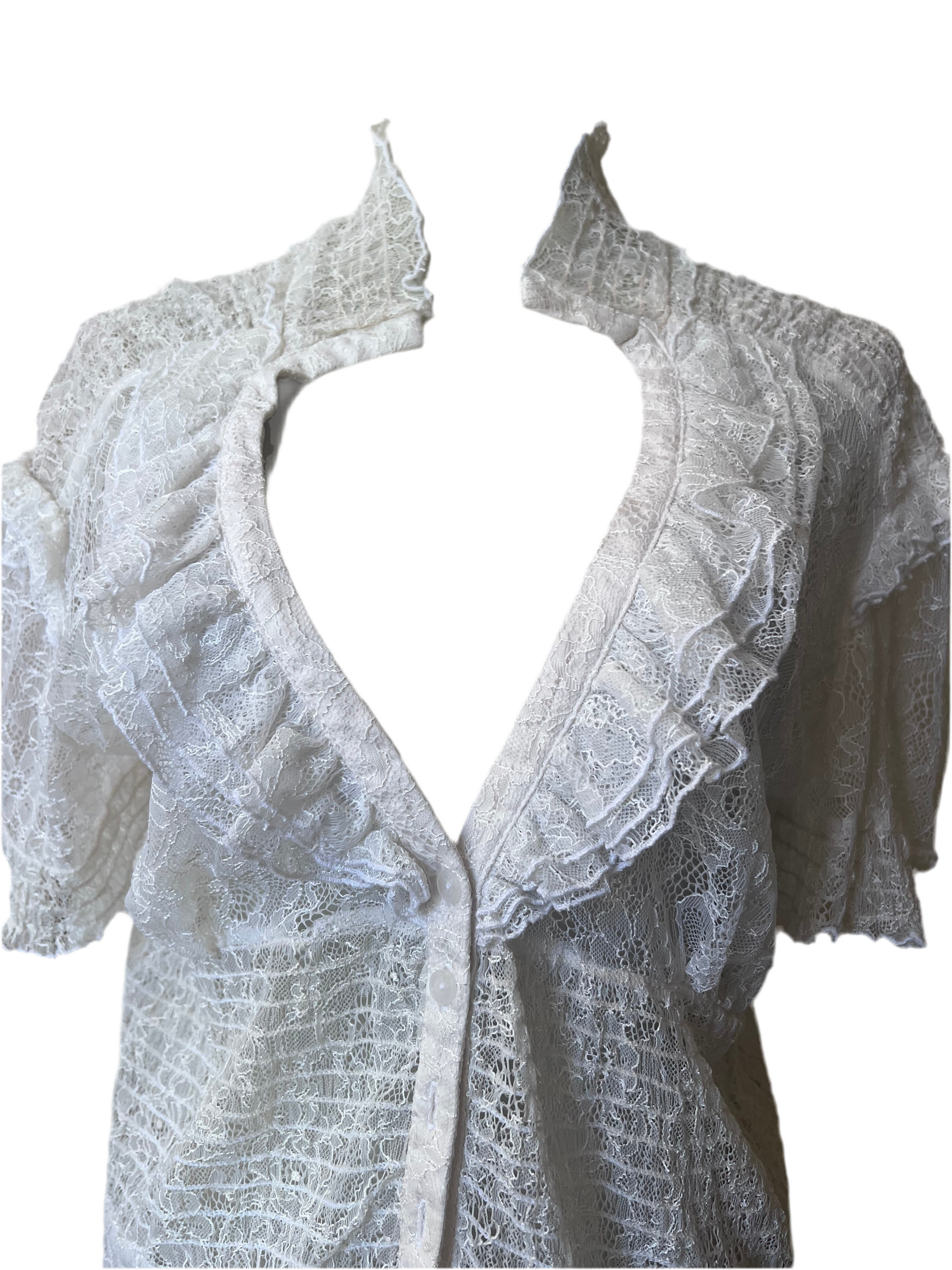 This exquisite vintage Bebe blouse features a delicate, sheer white fabric with intricate lace or ruffle details. The plunging V-neckline and short, airy sleeves give it a romantic yet alluring appeal. It perfectly captures that iconic Y2K/early 2000s glamorous aesthetic that Bebe was known for, making it a timeless statement piece.